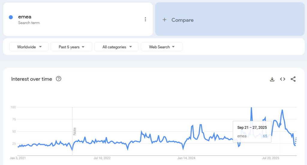 The trend to search for EMEA countries has risen significantly over the past 5 years from 2021 to 2026 on Google.